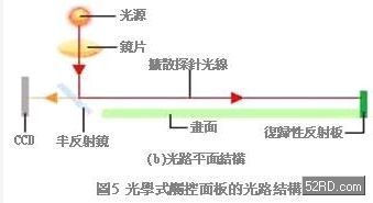 圖5是光學式觸控麵板的光路結構,由圖可知,若掌握無法折返光線的角度,理論上就可以輕易求得使用者觸押麵板的位置。
