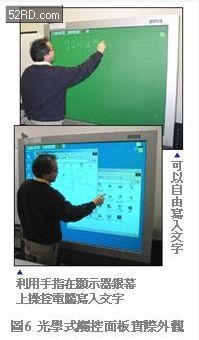 光guang學xue式shi觸chu控kong麵mian板ban的de設she計ji必bi須xu考kao量liang雷lei射she光guang線xian對dui人ren眼yan的de安an全quan,因yin此ci採採用yong低di功gong率lv半ban導dao體ti雷lei射she,然ran而er低di功gong率lv半ban導dao體ti雷lei射she卻que會hui引yin發fa復復歸gui光guang量liang不bu足zu等deng現xian象xiang。此ci外wai,CCD會同時擷取燈泡與太陽等外部光線,必需透過軟體的信號處理技術克服。圖6是光學式觸控麵板實際外觀。一般認為,大型光學式觸控麵板非常適合應用在教育、運動以及各種商務簡報等領域。