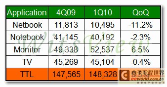 展望2010年第二季,WitsView認ren為wei第di一yi季ji過guo度du樂le觀guan的de出chu貨huo表biao現xian,使shi得de主zhu要yao應ying用yong別bie的de下xia遊you市shi場chang均jun存cun在zai庫ku存cun升sheng高gao的de疑yi慮lv,雖sui然ran目mu前qian仍reng未wei出chu現xian一yi線xian品pin牌pai明ming顯xian的de砍kan單dan效xiao應ying,但dan從cong4月下旬麵板價格已出現小幅度下跌的指針來看,支撐出貨量持續攀升的動能將有可能趨緩,因此WitsView現階段保守預估第二季整體麵板出貨量僅將小幅成長2%,未來品牌大廠需求減少幅度將為關鍵。