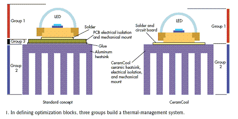 如圖1所示,Group1是LED本身,大體上仍是不能觸摸。中心位置是LED裸片以及一個將該裸片與LED底部連接起來的散熱銅條。從熱的角度講,理想方案是將LED裸片直接與散熱器綁定在一起。由於大規模生產的原因,這一概念在商業上行不通。我們把LED看作一個標準化的“目錄”產品,不能做改動。它是個黑盒子。