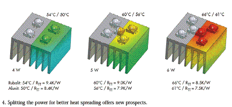 將熱點的溫度降低6k意味著可顯著減少LED的壓力。相同形狀Rubalit組件的總熱阻至少比鋁要好13%。使用Alunit可將CeramCool性能提升最少31%。如果考慮28K的熱降,則Rubalit和Alunit這兩種陶瓷材料帶來的實在的好處更要顯著得多。