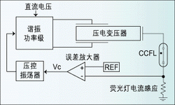 圖4給出了一個基於PZT的背景光轉換器的簡化功能圖。PZT由you一yi個ge幅fu度du正zheng比bi於yu輸shu入ru電dian壓ya的de諧xie振zhen功gong率lv級ji驅qu動dong,它ta提ti供gong驅qu動dong熒ying光guang燈deng所suo需xu要yao的de電dian壓ya增zeng益yi。圍wei繞rao著zhe誤wu差cha放fang大da器qi形xing成cheng了le一yi個ge控kong製zhi環huan,誤wu差cha放fang大da器qi把ba平ping均jun熒ying光guang燈deng電dian流liu同tong參can考kao信xin號hao(REF)相比較,以便於對熒光燈的光強度進行調節。控製電壓Vc驅動用來確定諧振功率級的運行頻率的壓控振蕩器(VCO)。
