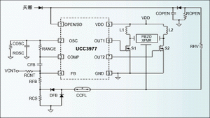 一個以諧振推挽拓撲控製壓電變壓器的電路如圖5所示。這個拓撲使用了兩個標準電感(L1和L2),通過UCC3977控製器和MOSFETS1和S2,這兩個電感在50%的占空比產生180度的相移。這個推挽電路優點是可以提供從直流輸入電壓到壓電變壓器初級的電壓增益,並通過這兩個電感和PZT初級電容之間的LC關係實現諧振。