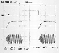 圖6顯示了基於壓電變壓器電路的脈衝調光波形。一個外部驅動信號(曲線4)用來給定工作周期和脈衝串的頻率,在本例中,在50%的工作周期脈衝串的頻率為100Hz。曲線1是反饋網絡的COMP引腳的信號,用來設定工作頻率。熒光燈電壓如曲線3所suo示shi。這zhe些xie圖tu片pian是shi使shi用yong數shu字zi示shi波bo器qi得de到dao,所suo以yi存cun在zai混hun迭die現xian象xiang。熒ying光guang燈deng的de激ji發fa電dian壓ya幾ji乎hu檢jian測ce不bu到dao,因yin為wei燈deng已yi經jing是shi熱re的de並bing從cong前qian麵mian的de脈mai衝chong串chuan周zhou期qi運yun行xing過guo來lai。