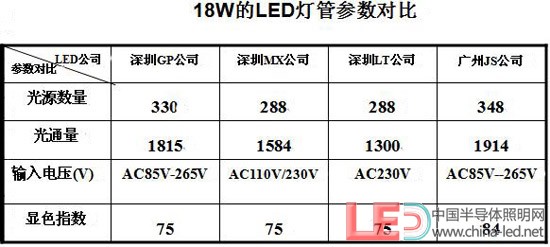 通過上麵的表格可以看出,以上我們任意選擇的四家公司的LED燈管的相關結果數據有的參數會有會有很大的差別,選用LED光源的數量從288-348顆,光通量也從1300-1914LM,相差的範圍有614LM之多,輸入的電壓有寬電壓,也有窄電壓。顯色指數基本在Ra=75左右,國家LED燈具標準出台後會有一個標準和規範。以上為各廠家自行測試結果(如上圖所示)