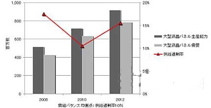 液晶麵板的供求關係在2009年春季至2010年中期的1年多時間裏,一直處於“供不應求”及“供需平衡”狀態。但DisplaySearch預計,到2012年中國本土及外資企業的大量生產線“開始量產”時,整個FPD產業將“陷入供給過剩局麵”。