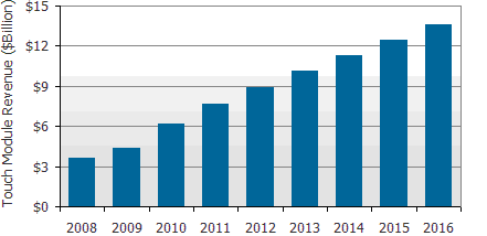 根據DisplaySearch最新出版2010觸控麵板市場分析報告指出2009年全球觸控麵板產值達43億美元,估計2016年將成長到140億美元,年複合成長率達18%。
