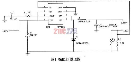FP7102芯片設計的小型探照燈,所有元器件安放在1×2.7cm的板子上,製作完成後整個燈可以塞進直徑為3cm的管子裏,管子長度可以任意長。為了達到應用板小型化,在此設計中使用FP7102芯片作為LED的驅動芯片,電路可靠度高、元件使用精簡、整體高效能運作,在應用上有很大的彈性空間,可滿足各種功率LED需要。