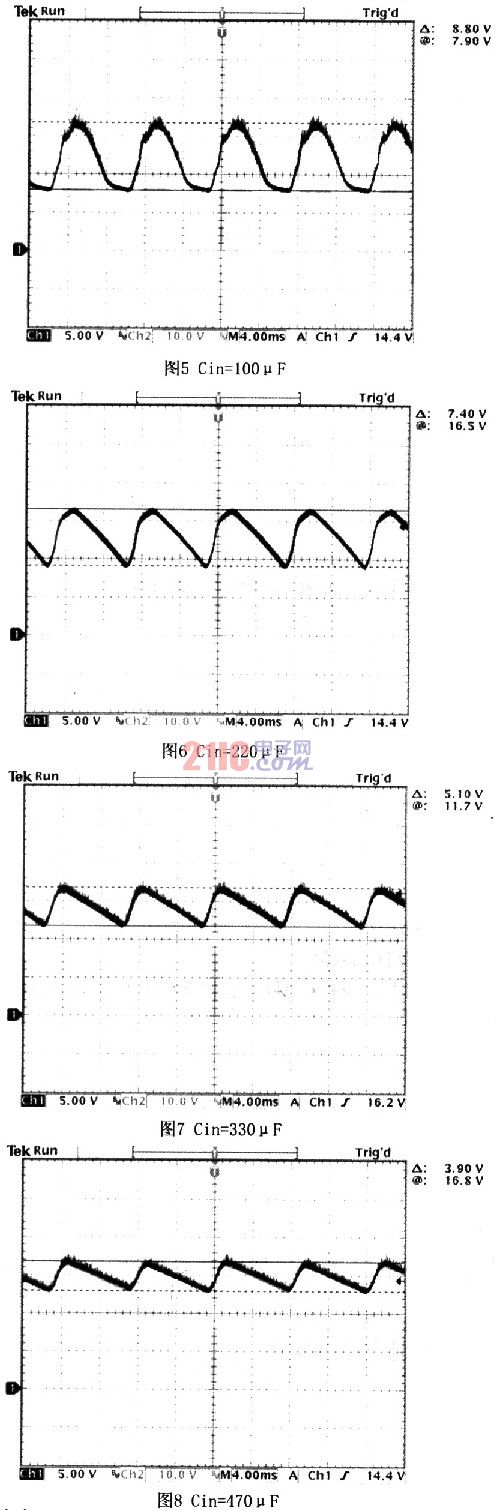 圖5~圖8列出了在不同輸入電容值情況下,輸入紋波Vin:CHl與SW:CH2的變化情形,輸入電容值越大輸入電壓紋波越小,圖5中因為紋波太大,造成Vin最小值剛好等於LED導通電壓,這時候PWM全開,如果電容更小時LED導通電壓不足,造成LED會無法發亮,圖8中電容用330μF就能讓輸入電壓不會過低。(串聯3顆1WLED)