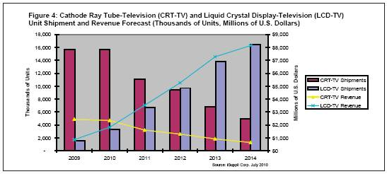 同時,CRT電視的單位出貨量將在2012年降到940萬台,而2011和2010年分別為1110萬和1570萬台。同時,液晶電視出貨量將在2012年上升到970萬台,而2011和2010年分別是660萬和330萬台。