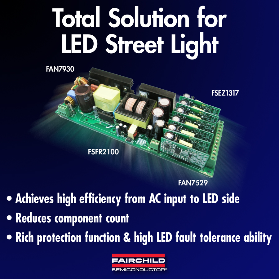 飛兆半導體公司( Fairchild Semiconductor) 位於中國的全球功率資源中心 (Global Power ResourceSM Center, GPRC) 開發出一款完整的LED路燈照明解決方案,具有高能效和出色的熱性能,以及高可靠性,能夠延長路燈的使用壽命。