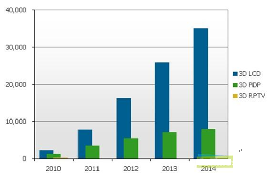 圖一:2010-2014 3D電視按不同應用技術出貨量預測(單位:千台)