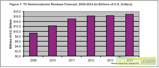 2009年電視半導體銷售額高達93億美元,由於液晶電視需要更多的半導體芯片支持各種高級功能,2010年銷售額有望更上層樓。iSuppli公司的預測顯示,2010年電視半導體市場將達到121億美元。