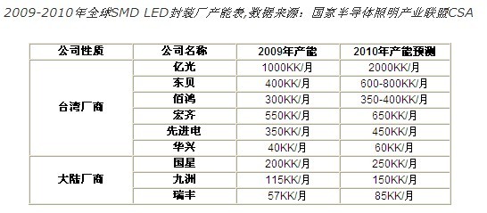 台灣封裝第一大廠億光2010年LED TV背光源出貨大幅放量,已接到LG、三星、瑞軒等大廠訂單,初步規劃,SMD月產能將從10億顆倍增至20億顆。另一大廠東貝目前SMD月產能為4億顆,2010年也是鎖定擴充大尺寸背光用SMD封裝產能,SMD月產能將達到6億顆至8億顆,而宏齊以及佰鴻也都有擴產計劃。2010年台廠SMD產能成長至少5成至1倍。