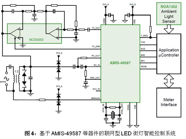 設計人員可以采用安森美半導體的AMIS-49587電力線載波(PLC)調製解調器、PLC線路驅動器NCS5650和諸如NOA1302這樣的環境光傳感器,基於電力線輕易地構建聯網型LED街燈智能控製係統(參見圖4)。其中,安森美半導體的環境光傳感器包含的輸出類型,如NOA1302和NOA1305提供的是數字輸出,而NOA1211為模擬輸出。這些光傳感器的工作電流極低,在100流明光輸出條件下分別僅為58 μA、550 μA和115 μA,因而對係統能效的影響極小。