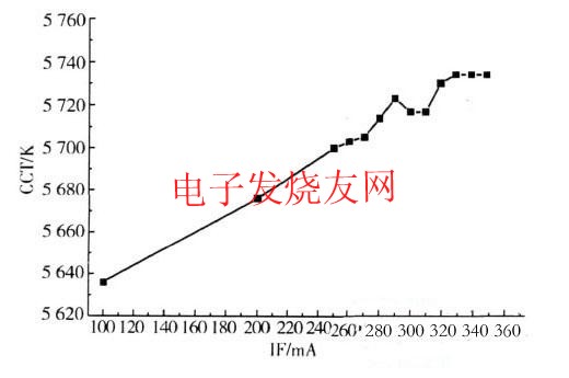 從圖2中可以看出,隨著器件的驅動電流增加,功率型白光LED的色溫從100mA電流時的5636K增加到350mA電流時的5734K。這(zhe)是(shi)因(yin)為(wei),電(dian)流(liu)加(jia)大(da)後(hou),芯(xin)片(pian)發(fa)出(chu)的(de)藍(lan)光(guang)增(zeng)多(duo),熒(ying)光(guang)粉(fen)層(ceng)的(de)厚(hou)度(du)是(shi)一(yi)定(ding)的(de),則(ze)在(zai)出(chu)射(she)的(de)白(bai)光(guang)中(zhong)藍(lan)光(guang)成(cheng)份(fen)增(zeng)加(jia),從(cong)而(er)使(shi)器(qi)件(jian)的(de)色(se)溫(wen)增(zeng)加(jia)。