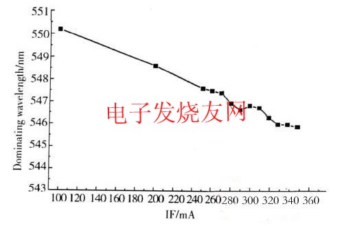隨著電流增加,器件出光的主波長在減小,這是因為電流增加,色坐標減小,標準白光點和色坐標點的連線的延長線與380~760nm的光譜軌跡相交點對應的波長值變小。