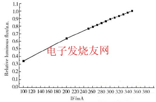發光二極管在調節光通量方麵具有一定的優勢,器件的光通量隨著電流增加而增加,在100mA~250mA,光通量增加率為126.2%;從250mA~350mA時,電流的增加輻度較小且呈非線性增加,增加率為30.4%。PN結(jie)是(shi)發(fa)光(guang)二(er)極(ji)管(guan)的(de)核(he)心(xin)部(bu)分(fen),電(dian)流(liu)增(zeng)加(jia)後(hou),注(zhu)入(ru)到(dao)發(fa)光(guang)區(qu)的(de)電(dian)子(zi)和(he)空(kong)穴(xue)數(shu)量(liang)增(zeng)加(jia),發(fa)生(sheng)輻(fu)射(she)複(fu)合(he)的(de)數(shu)量(liang)也(ye)會(hui)增(zeng)加(jia),器(qi)件(jian)的(de)光(guang)通(tong)量(liang)增(zeng)加(jia)。但(dan)當(dang)注(zhu)入(ru)電(dian)流(liu)繼(ji)續(xu)增(zeng)加(jia)到(dao)某(mou)一(yi)值(zhi)時(shi),光(guang)通(tong)量(liang)輸(shu)出(chu)不(bu)再(zai)增(zeng)加(jia),趨(qu)於(yu)飽(bao)和(he)。