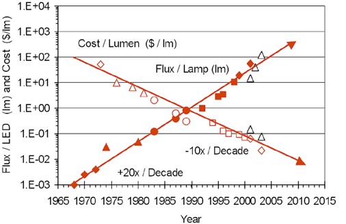 上述的講法聽來有些讓人疑惑,今日不是一直強調LED的亮度突破嗎?2003年LumiledsLighting公司RolandHaitz先生依據過去的觀察所理出的一個經驗性技術推論定律,從1965年第一個商業化的LED開始算,在這30多年的發展中,LED約每18個月;24個月可提升一倍的亮度,而在往後的10年內,預計亮度可以再提升20倍,而成本將降至現有的1/10,此也是近年來開始盛行的Haitz定律,且被認為是LED界的Moore(摩爾)定律。