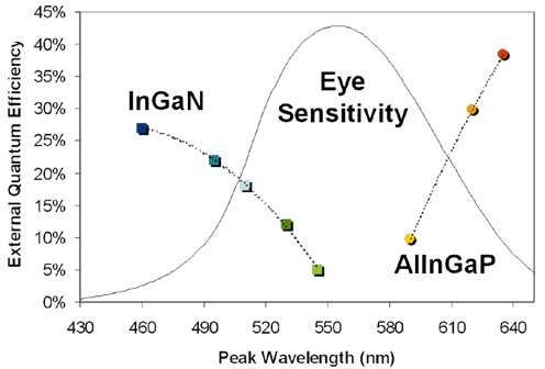 圖中為InGaN與AlInGaP兩種LED用的半導體材料,在各尖峰波長(光色)下的外部量子化效率圖,雖然最理想下可逼近40%,但若再將光取效率列入考慮,實際上都在15%;25%間,何況兩種材料在更高效率的部分都不在人眼感受性的範疇內,範疇之下的僅有20%。