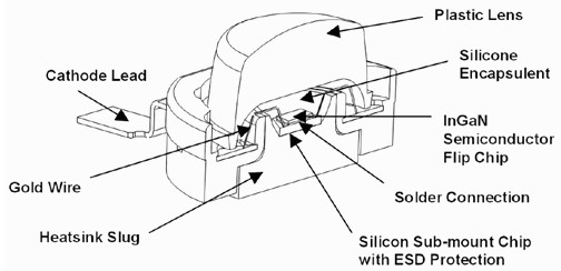 從Lumileds公司Luxeon係列LED的橫切麵可以得知,矽封膠固定住LED裸晶與裸晶上的熒光質(若有用上熒光質的話),然後封膠之上才有透鏡,而裸晶下方用焊接(或導熱膏)與矽子鑲嵌芯片(SiliconSub-mountChip)連接,此芯片也可強化ESD靜電防護性,往下再連接散熱塊,部分LED也直接裸晶底部與散熱塊相連。
