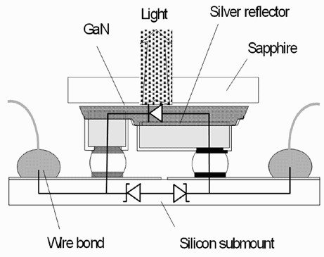 Lumileds公司Luxeon係列LED的裸晶實行覆晶鑲嵌法,因此其藍寶石基板變成在上端,同時還加入一層銀質作為光反射層,進而增加光取出量,此外也在SiliconSubmount內製出兩個基納二極管(ZenerDiode),使LED獲得穩壓效果,使運作表現更穩定。