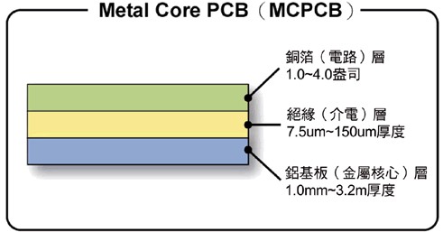 為了改善電路板層麵的散熱,因此提出了所謂的金屬核心的印刷電路板(MetalCorePCB;MCPCB),即是將原有的印刷電路板附貼在另外一種熱傳導效果更好的金屬上(如:鋁、銅),以此來強化散熱效果,而這片金屬位在印刷電路板內,所以才稱為「MetalCore」,MCPCB的熱傳導效率就高於傳統FR4PCB,達1W/m.K∼2.2W/m.K。