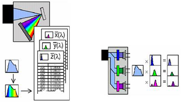現有的顏色特性測試方法有分光光度法和積分法。分光光度法是通過單色儀分光測得LED光譜功率分布,然後利用色度加權函數積分獲得對應色度參數;積分法是利用特定濾色片配合光電探測器直接測得色度參數(見圖7)。分光光度法的準確性要大大高於積分法。