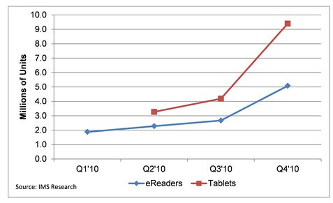 報告顯示,在2010年的假期中,平板電腦和電子書閱讀器的市場十分火爆。電子書閱讀器出貨量在2010年第四季度相比於第三季度增長了90%,而全年的增長量為116%,銷量達到了510萬台,其中亞馬遜的Kindle和Barnes & Noble公司的NOOK成為了最大贏家。