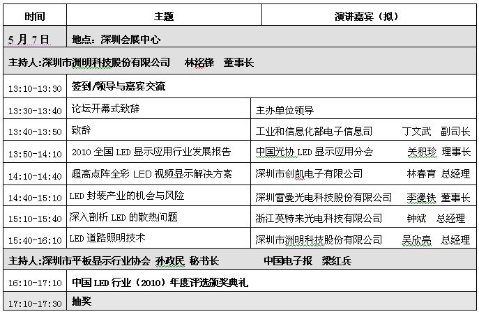1.講座 主辦方將邀請國內知名LED行業專家分析2010年中國LED產業發展問題、2011年中國LED企業的總戰略及調整方向,預測中國LED市場各領域(原材料、設備、外延芯片、顯示屏、照明等)的投資情況分析及趨勢。