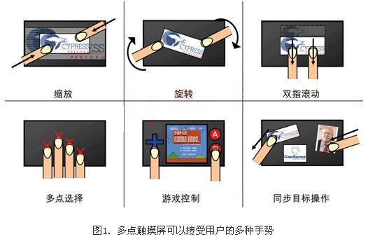 用投射式觸摸屏實現的幾種常見的多點觸摸手勢包括手指的張合、縮放、雙指的滑動和旋轉。它們可以快速方便地處理數據、內容和用戶參數。便攜遊戲和文本/電子郵件應用也可以利用多點觸摸技術。在一個多指觸摸過程中,多觸點APA(全點可尋址)模式可以精確地測定每個手指所按壓的坐標位置。