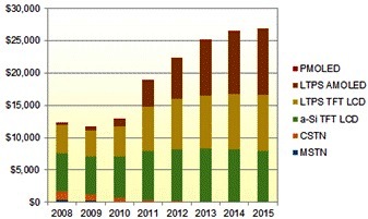 DisplaySearch報告亦顯示,2010年非晶矽(a-si) TFT LCD以61.5%市占率領先所有手機麵板顯示技術,而低溫多晶矽(LTPS) TFT LCD 在智能手機應用市場更具競爭力,在2010年手機應用市場出貨達到3億1,600萬片,占19.5%比例。
