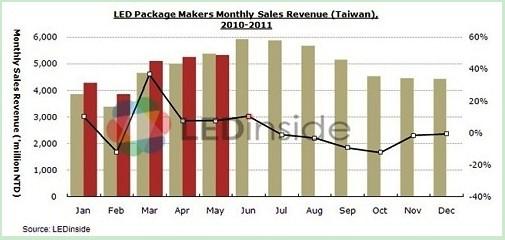 近日消息,據統計,2011年5月台灣上市上櫃 LED 廠商營收總額約新台幣99.57億元(月成長5.8%、年成長8.3%)。