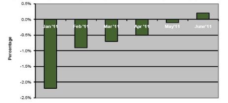 下圖所示為IHS iSuppli公司對今年1到6月大尺寸液晶麵板價格逐月走勢的預測。大尺寸液晶麵板,是指對角尺寸為10.1至55英寸及以上的麵板。