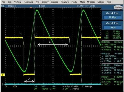 圖3 詳細地示意了LED驅動器在一個完整交流電周期內Q3的漏源電壓和電流情況。