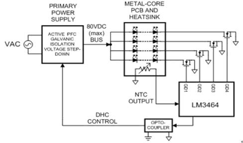 此外,本文還將給出另外一種實現方法的結構示意圖,即采用隔離式AC/DC電源及一款具有動態餘量控製的LM3464。通過避免電磁幹擾,該方案具有極高效率。