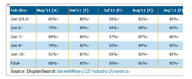 DisplaySearch最新發布的研究報告指出,由於2011年第三季度市場需求不太明朗,大尺寸TFT LCD麵板價格在6月yue中zhong旬xun停ting止zhi上shang漲zhang。隨sui著zhe市shi場chang需xu求qiu特te別bie是shi電dian視shi市shi場chang需xu求qiu的de減jian少shao,麵mian板ban供gong應ying商shang積ji極ji調tiao整zheng以yi防fang止zhi麵mian板ban價jia格ge出chu現xian大da幅fu波bo動dong。麵mian板ban商shang原yuan本ben計ji劃hua於yu第di三san季ji度du啟qi動dong全quan部bu產chan能neng,使shi平ping均jun利li用yong率lv達da到dao90%。但根據DisplaySearch 6月份更新的MarketWise-LCD Industry Dynamics報告顯示,從6月份到9月份TFT LCD麵板實際產能利用率將一直維持在85%。