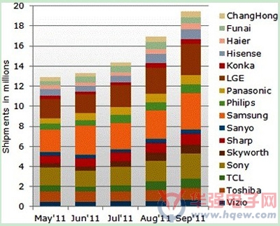 根據DisplaySearch的 MarketWise-LCD Industry Dynamics 報告,全球前十六大品牌商7月份電視總產量為1,440萬台,8月份為1,690萬台,9月份更將提高到1,940萬台。另一方麵液晶電視 OEM / ODM廠商7月份產量估計達390萬台,8月份為470萬台,9月份將達540萬台。