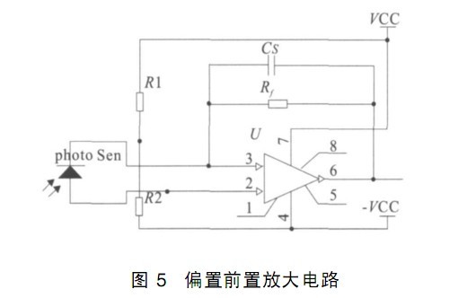(1)由於運算放大器是雙電源器件,通過合理的選擇偏置電阻使光電轉換前置放大電路的輸出電壓達到合適的幅值(即設置適當的靜態工作點) , 以獲得最大的電壓擺幅, 避免飽和失真。 如圖 6 電路所示,電壓輸出設置於- 4 V 左右, 避免因強烈的環境光造成的飽和失真。