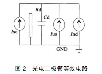 圖2 中I sc為光電流; Rd 為二極管內阻; Cd 為二級管結電容; I ns 為二級管的散粒噪聲電流; I nd為二極管內阻的熱噪聲電流。 光電二極管與後續的理想運放構成前置放大電路時, 影響其性能參數的因素主要是以下幾點: