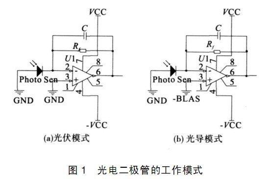 光電二極管可以在2 種模式下工作, 一是零偏置的光伏模式; 一是反偏置的光導模式,具體電路如圖1 所示。 在光伏模式時, 光電二極管可以非常精確地線性工作; 而在光導模式時, 光電二極管能夠實現較高的切換速度, 但要犧牲線性; 同時, 反偏置模式下的光電二極管即使在無光照條件下也會產生一個極小的暗電流, 暗電流可能會引入輸入噪聲。 因此選用光伏模式。