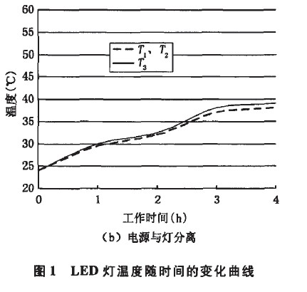 由於電源本身產生一定的熱量,使得LED燈上的熱量來源增加。同時,電源與燈一體設計使得LED燈整體受熱不均,這些因素都會導致燈具發生疲勞和早期失效,而影響其壽命。圖1為LED燈溫度隨工作時間的變化曲線,圖中T1為放置電源處溫度,T2為遠離電源處溫度,T3為燈體中心溫度。從圖中看出,隨著工作時間的增加,圖1(a)中T1遠大於T2和T3;圖1(b)中T1與T2兩曲線重合,T3略大於T1和T2。可見分離電源後,整燈的溫度分布很均勻。