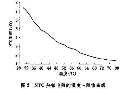 控製電路阻值與輸出總電流的關係列於表1,其中R為控製電路的等效電阻。經過在恒溫箱中測試,每2℃記錄1組數據得到如圖5所示的NTC熱敏電阻的溫度一阻值曲線。該方案中,驅動電源通過接收到反饋的溫度信息來控製輸出電流,根據圖5中NTC的溫度與阻值的關係,隻要找到輸出電流隨總阻值的變化關係(如圖6所示),再進行適當的電阻匹配,便可找到溫度與驅動器輸出電流的關係。