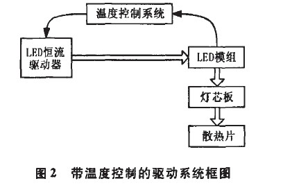 此方案通過控製驅動器的輸出電流來實現對LED燈的溫度控製。圖2為恒流驅動器驅動LED燈框圖,驅動器輸出到LED模組,LED模組上產生的熱量通過良好的導熱材料傳導到燈芯板,最後經由散熱片散熱到大氣中。當外界散熱環境惡劣時,LED模組的溫度會達到溫度控製係統設定的溫度,得到反饋的信息後,驅動器減少輸出,達到限製並降低LED模組溫度的目的。