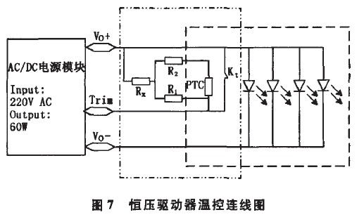 圖7為恒壓驅動器溫控的連線圖。Trim端用來調節電源的輸出。左側點線型虛線框中部分為控製電路,其中:PTC為正溫度係數溫敏電阻;R1、R2、R,均為普通電阻,與PTC溫敏電阻匹配調節驅動器輸出電壓;Kt為常閉型溫度繼電器,其斷開溫度為60℃,自動閉合溫度為48%。右側虛線框中部分為LED模塊部分。Kt和PTC安裝在LED模塊上,並與模塊緊密接觸。常溫下Kt處於閉合狀態,此時控製電路中控製驅動器額定輸出,該LED模組常溫工作額定總電壓為24V。當繼電器溫度上升到60℃時Kt