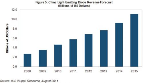由於更加廣泛地用於液晶電視和街道照明,LED已成為中國製造的熱門產品,而且是很有吸引力的投資領域。另外,政府對該產業的支持似乎正在產生效果。預計明年中國LED市場將達到69億美元,到2015年達到111億美元,2010-2015年的複合年度增長率為17.7%,如圖所示。