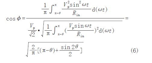 從式(5)可得電路的功率因數如式(6)所示,功率因數隨可控矽的導通角的關係如圖3b)所示。