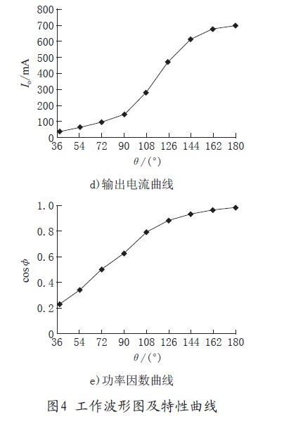 圖4d)為可控矽不同導通角對應的輸出電流曲線,實際調試中可控矽導通角在150°之後就接近滿載輸出了。圖4e)為可控矽在不同導通角下對應電路的cosφ曲線。