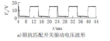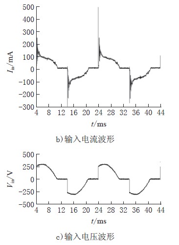 圖4a)、b)、c)為可控矽導通角為115°時阻抗匹配開關驅動電壓VZ、輸入電流Iin、輸入電壓Vin的波形,電路的輸出電流為470mA,功率因數為0.78。從(cong)圖(tu)中(zhong)可(ke)看(kan)出(chu),當(dang)可(ke)控(kong)矽(gui)導(dao)通(tong)瞬(shun)間(jian),由(you)於(yu)驅(qu)動(dong)器(qi)輸(shu)入(ru)端(duan)有(you)差(cha)模(mo)濾(lv)波(bo)電(dian)容(rong)導(dao)致(zhi)輸(shu)入(ru)電(dian)流(liu)有(you)衝(chong)擊(ji)電(dian)流(liu)尖(jian)峰(feng),而(er)當(dang)輸(shu)入(ru)電(dian)流(liu)小(xiao)於(yu)一(yi)定(ding)值(zhi)時(shi),阻(zu)抗(kang)匹(pi)配(pei)開(kai)關(guan)開(kai)通(tong)以(yi)保(bao)證(zheng)流(liu)過(guo)可(ke)控(kong)矽(gui)的(de)電(dian)流(liu)大(da)於(yu)其(qi)維(wei)持(chi)電(dian)流(liu)。