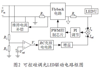 圖2是一種利用普通的脈寬調製PWM芯片結合外圍電路來搭建可控矽調光的LED驅動電路框圖。維持電流補償電路通過檢測R1端電壓(即輸入電流)來控製流過維持電流補償電路的電流。當輸入電流較小時,維持電流補償電路上流過較大的電流;當輸入電流較大時,維持電流補償電路關斷,維持電流補償以恒流源的形式保證可控矽的維持電流。調光控製電路包括比較器、RC充放電電路和增益電路。實驗中選用一款旋鈕行程和斬波角成正比的可控矽調光器,其最小導通角約為30°。